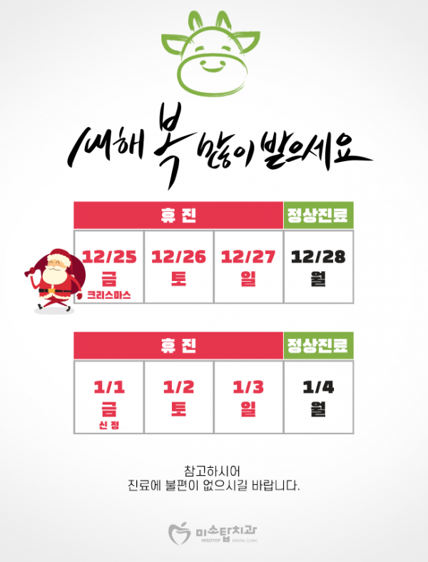 목록 2020년 12월 / 2021년 1월 진료안내 작성자 미소탑 작성일 20-12-20 22:13 | 조회 5,117 | 댓글 0 본문 참고하시어 진료에 불편이 없으시길 바랍니다. 이전글다음글 댓글목록 0 등록된 댓글이 없습니다. 목록