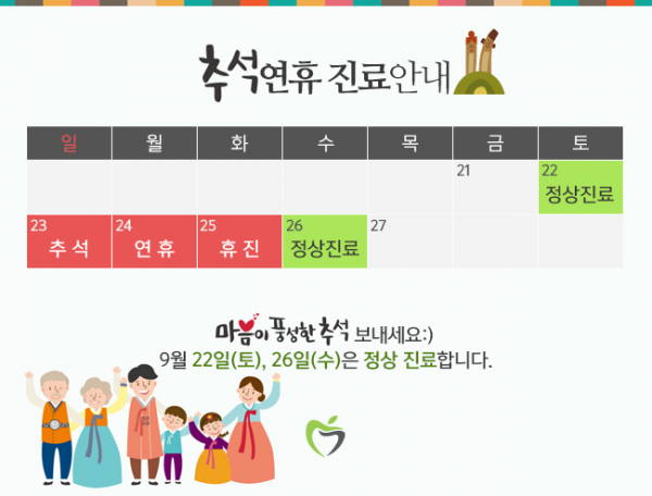 목록 2018년 추석연휴 진료안내 작성자 미소탑 작성일 18-09-19 12:29 | 조회 5,607 | 댓글 0 본문 9월 22일(토), 26일(수)은 정상 진료합니다. 참고하시어 진료에 불편이 없으시길 바랍니다. 이전글다음글 댓글목록 0 등록된 댓글이 없습니다. 목록